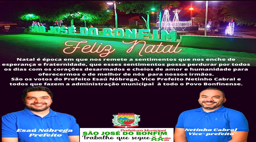 Natal é época em que nos remete a sentimentos que nos enche de esperança e fraternidade, que esses sentimentos possa perdurar por todos os dias com os corações desarmados e cheios de amor e humanidade para oferecermos o de melhor de nós para nossos irmãos. São os votos do prefeito Esaú Nóbrega, vice-prefeito Netinho Cabral e todos que fazem a administração municipal à todo o povo bonfinense.