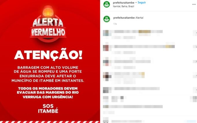 A prefeitura de Itambé, cidade no sudoeste da Bahia, anunciou na noite deste sábado (25) que uma barragem da região se rompeu e que uma forte enxurrada deve atingir áreas do município.