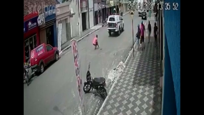 Imagens de monitoramento da cidade flagraram o momento em que a viatura passa por uma lombada e o detento, mesmo algemado, consegue pular do veículo.