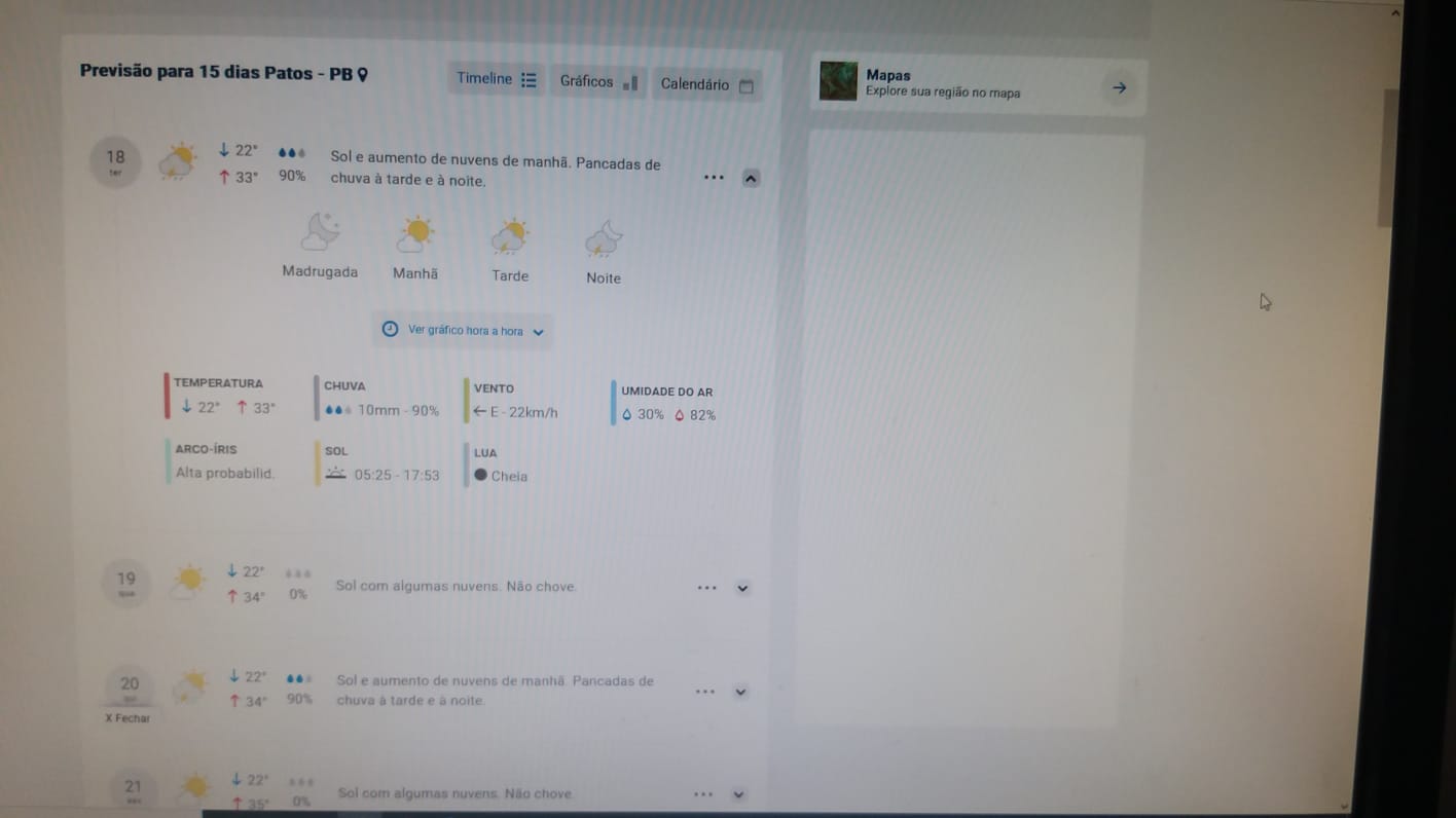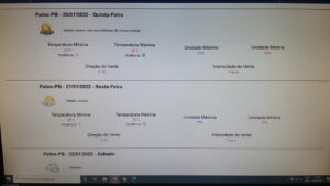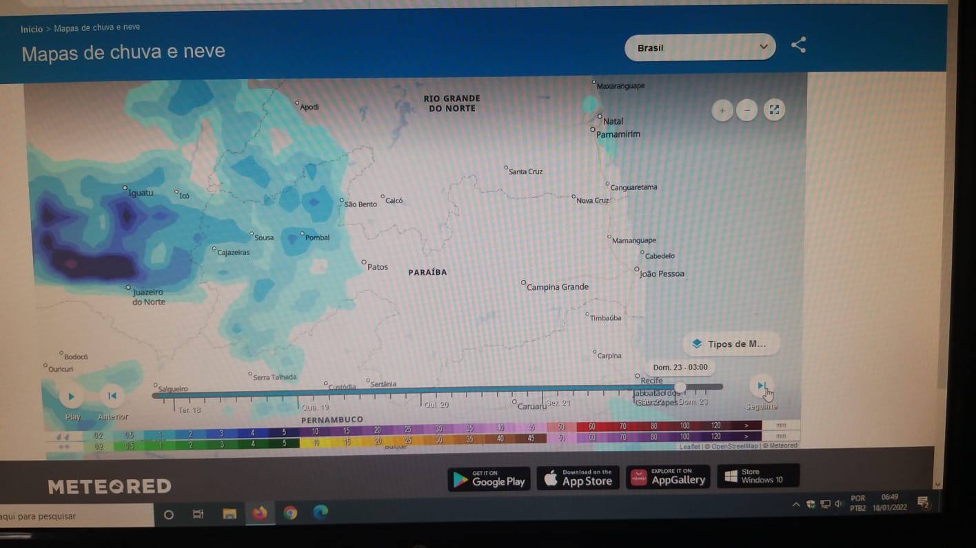 Os modelos climáticos disponibilizados na manhã desta terça-feira (18/01/22) pelos principais institutos de meteorologia do pais (INMET, Climatempo, Tempo Agora) e o internacional (Meteored), trazem a informação de que a semana será de poucas chuvas ou de chuvas isoladas e intercaladas em Patos e região. Foi o que identificou o técnico da EMPAER Marconi Palmeira Filho no novo levantamento feito hoje (18/01/22) às 6:42.