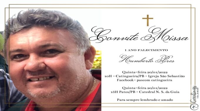 A família do advogado doutor Humberto Pires convida parentes e amigos para participarem da missa de um ano em sufrágio de sua alma que acontece às 10h da quinta-feira, 20/01, na Igreja São Sebastião, em Catingueira; e às 18h na Catedral de Patos Nossa Senhora da Guia, em Patos.