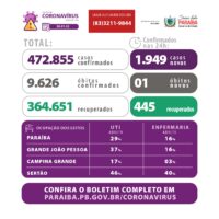 Até esta quinta, 222 cidades paraibanas registraram óbitos por Covid-19. O óbito divulgado, neste boletim, ocorreu no dia 19 de janeiro. Era uma mulher, de 80 anos, residente em João Pessoa. Tinha hipertensão e diabetes.