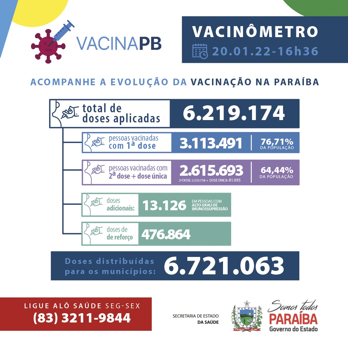Estão com esquemas vacinais atrasados na Paraíba, com base nos aprazamentos preconizados pelo Ministério da Saúde, 675.062 indivíduos. Esse número se refere às pessoas que receberam a primeira dose e não receberam a segunda, ou que receberam ambas as doses do esquema primário e ainda não receberam o reforço. A Paraíba já distribuiu um total de 6.721.063 doses de vacina aos municípios.
