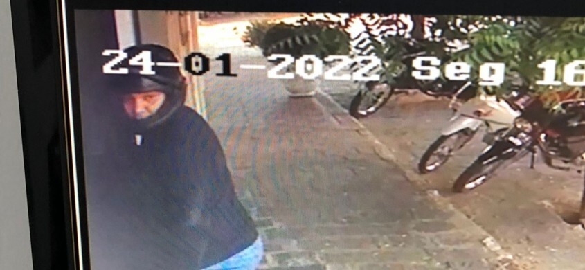Era exatamente 16h41 quando a dupla chegou ao estabelecimento de moto e foi logo entrando. O garupa estava com roupa e equipamento de delivery. Ele anunciou o assalto de arma em punho e obrigou o dono ir para o escritório.