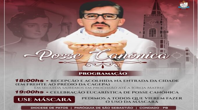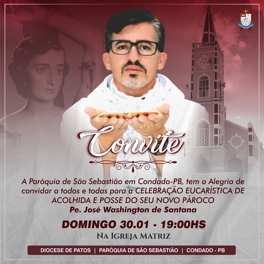 A Paróquia de São Sebastião, em Condado, na Região Metropolitana de Patos, tem a alegria em convidar a todos e todas para a missa de posse do seu novo pároco o padre José Washington de Santana.