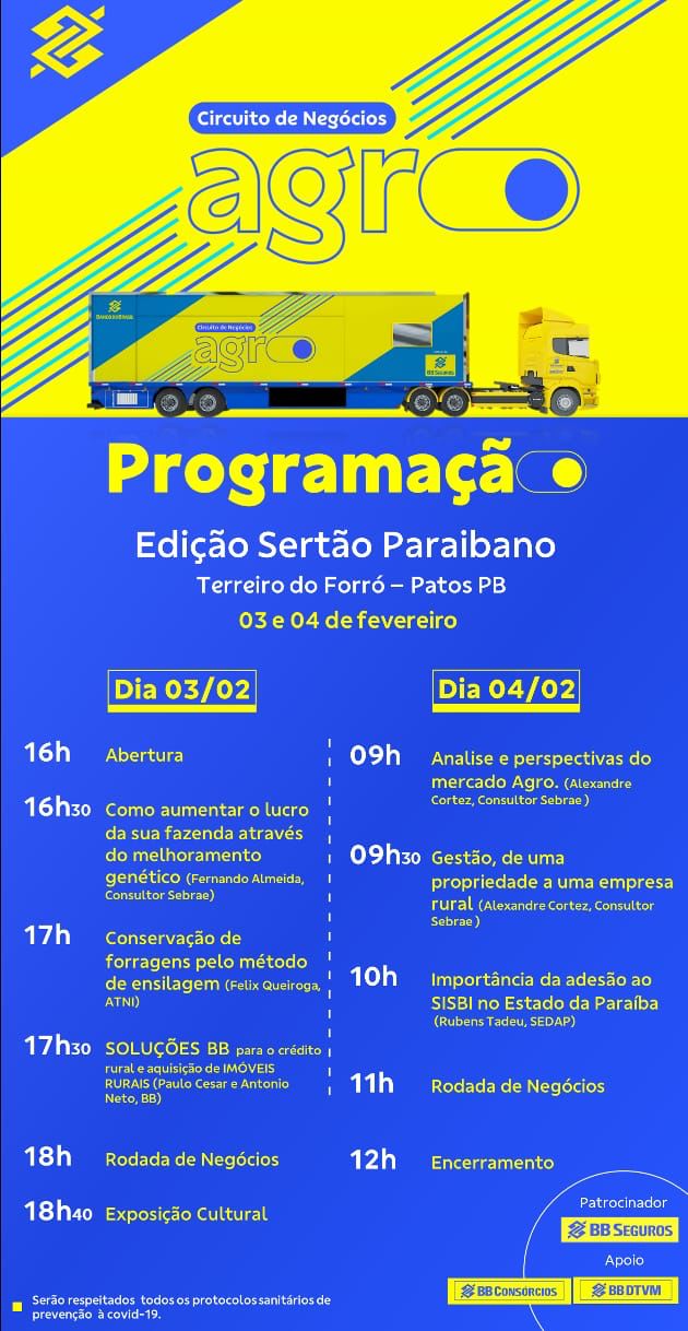 Acontece nesta quinta-feira, 03/02, e sexta-feira, 04, no Terreiro do Forró, em Patos, o Circuito de Agronegócios – Edição Sertão Paraibano, promovido pelo Banco do Brasil.