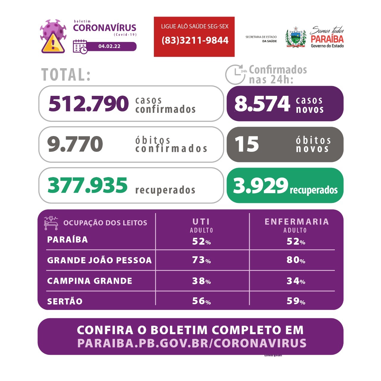 A Secretaria de Estado da Saúde (SES) registrou, nesta sexta (4), 8.574 casos de Covid-19, sendo 69 (0,8%) moderados ou graves e 8.505 (99,2%) casos leves. Agora, a Paraíba totaliza 512.790 casos confirmados da doença, que estão distribuídos por todos os 223 municípios. Até o momento, já foram realizados 1.337.079 testes para diagnóstico da Covid-19.