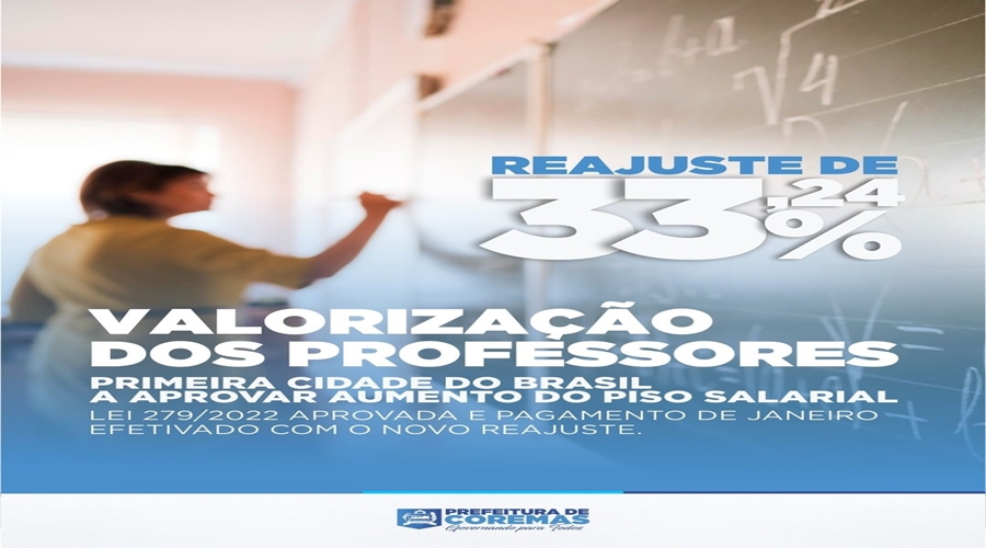 Reajuste de 33,24% mostra comprometimento do Governo Municipal com a educação. A Lei 279/2022 já foi aprovada no dia 26 de janeiro e o pagamento foi efetivado com o novo reajuste.