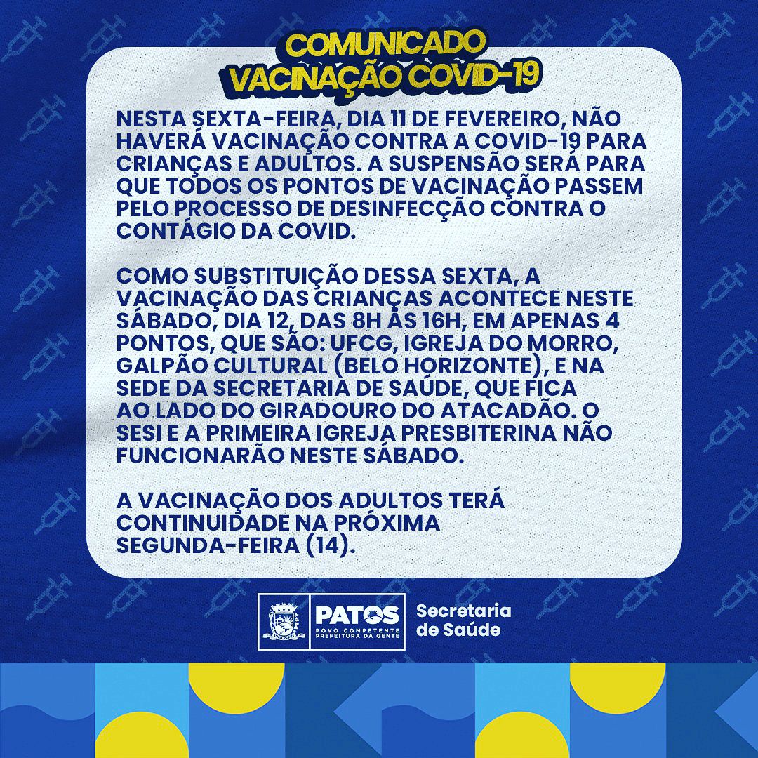 A Prefeitura de Patos, por meio da Secretaria Municipal de Saúde, comunica que nesta sexta-feira (11) não haverá vacinação contra a Covid-19, tendo em vista que os 4 pontos da vacinação de jovens e adultos, bem como a Primeira Igreja Presbiteriana de Patos, que está disponível para a vacinação das crianças, passarão pelo processo de desinfecção contra o contágio da Covid.