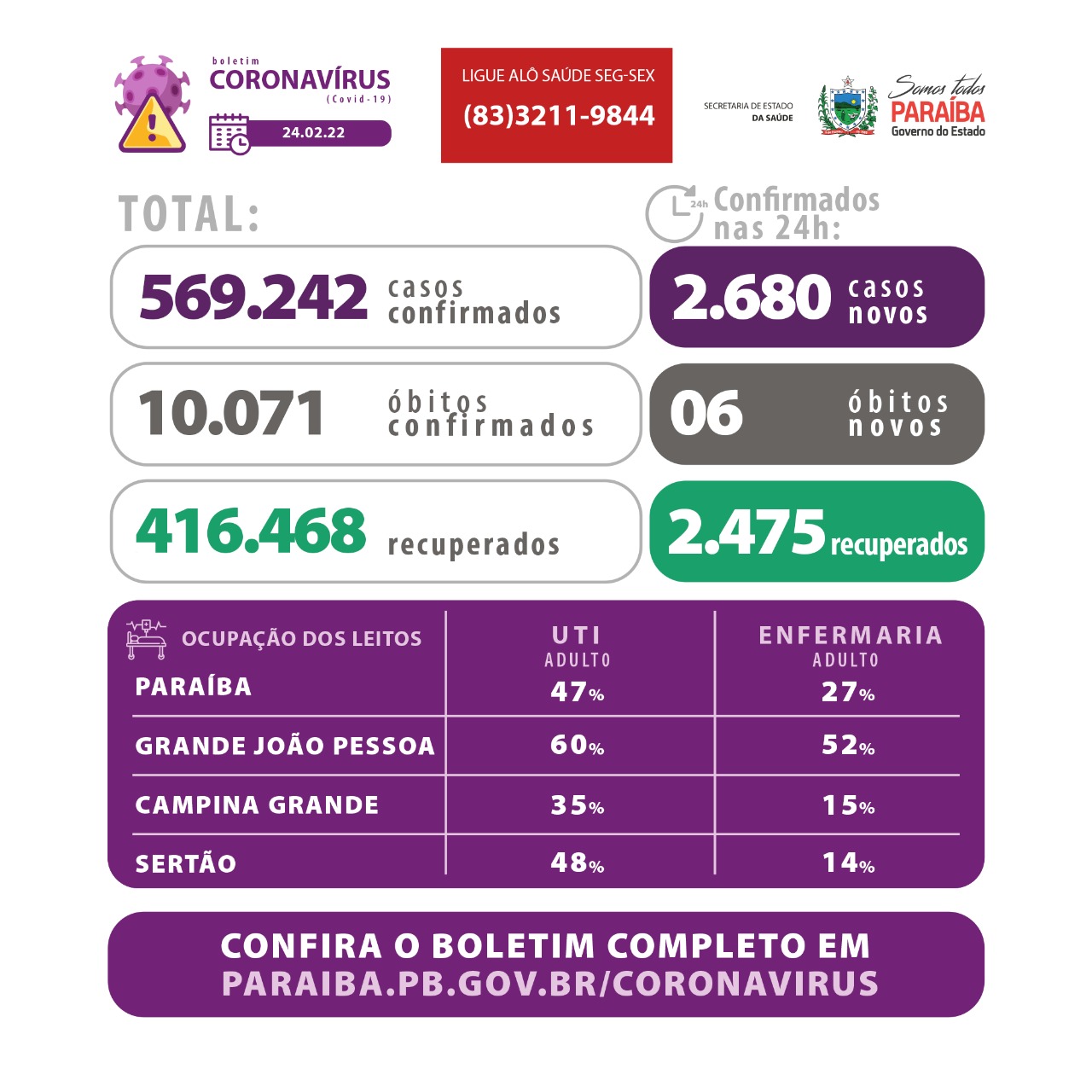 Os dados epidemiológicos com informações sobre todos os municípios e ocupação de leitos estão disponíveis em: www.paraiba.pb.gov.br/coronavirus.