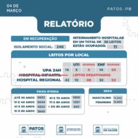 Nas últimas 24 horas foram constatados 12 casos da Covid em Patos; nesse mesmo período, 37 pessoas estão recuperadas; 246 estão em isolamento domiciliar e 11 em internamento hospitalar.