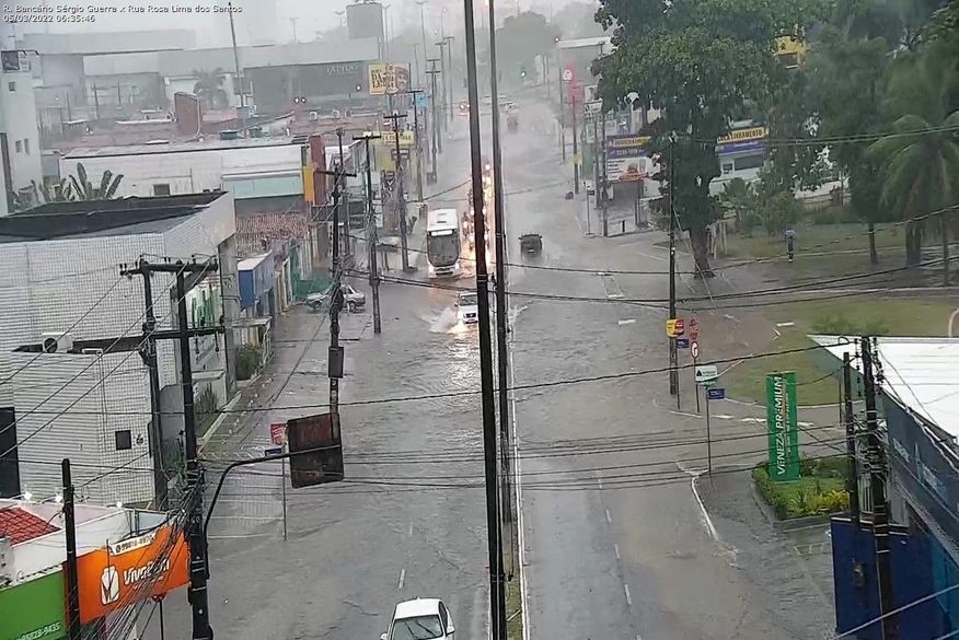 As fortes chuvas que caem na manhã deste sábado (5) deixaram as ruas alagadas e o trânsito bastante lento em João Pessoa. De acordo com as câmeras de monitoramento da Semob, a principal dos Bancários, em frente ao Equilíbrio do Ser, apresenta acúmulo de água, além do trânsito lento nos dois sentidos.