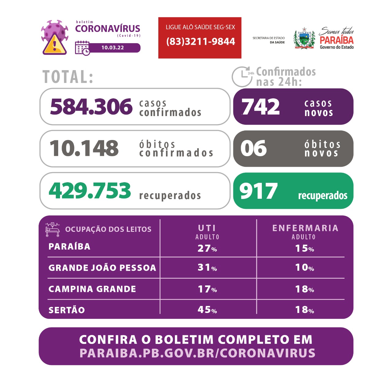 A Secretaria de Estado da Saúde (SES) registrou, nesta quinta (10), 742 casos de Covid-19. Entre os casos confirmados neste boletim, 12 (1,62%) são moderados ou graves e 730 (98,38%) são leves. Agora, a Paraíba totaliza 584.306 casos confirmados da doença, que estão distribuídos por todos os 223 municípios. Até o momento, já foram realizados 1.473.282 testes para diagnóstico da Covid-19.