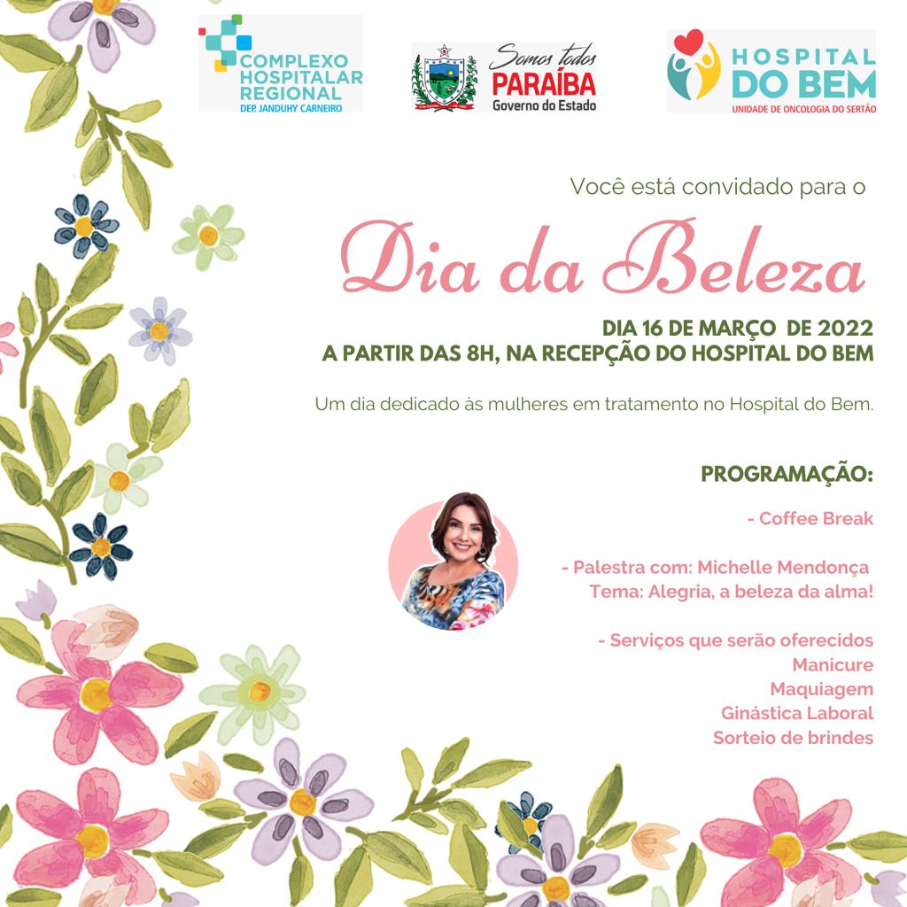 As pacientes do Hospital do Bem de Patos vivenciarão momentos especiais nesta terça-feira (15) e bem diferentes da rotina de uma unidade oncológica. Isto porque ao invés delas irem apenas para consultas ou para a realização de algum procedimento ou tratamento, elas cuidarão do visual, tendo à disposição vários serviços, a exemplo de manicure, maquiagem e sessões de ginástica laboral. A programação em comemoração ao mês da mulher terá ainda um coffe break, sorteio de brindes e ainda umaa palestra com a Coach e Perita Criminal, Michelle Mendonça, sobre ‘Alegria, a beleza da alma!’. O evento começa a partir das 8h e só será encerrado por volta das 17h.