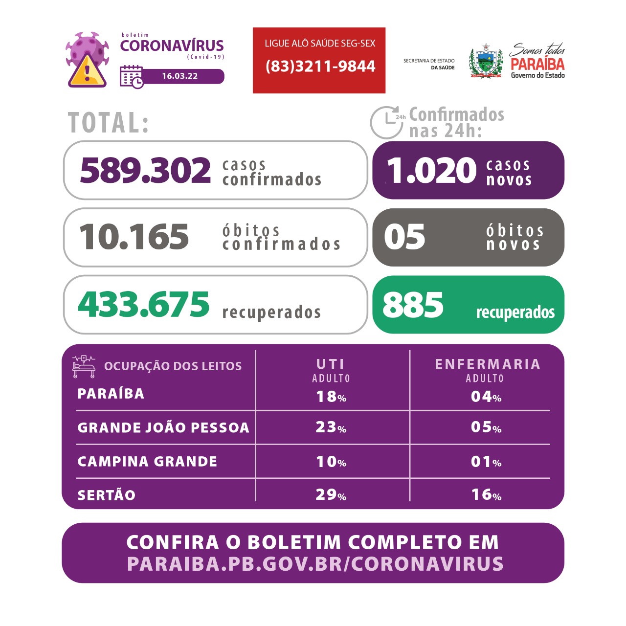 Os dados epidemiológicos com informações sobre todos os municípios e ocupação de leitos estão disponíveis em: www.paraiba.pb.gov.br/coronavirus.