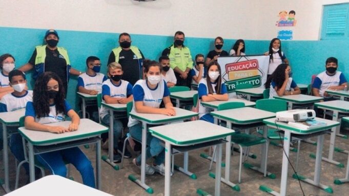 A atividade aconteceu com os alunos do 9º ano da Escola Municipal Allyrio Meira Wanderley, no bairro Salgadinho, e teve como objetivo levar informações sobre o trânsito e conscientizar os estudantes sobre a importância da prevenção.