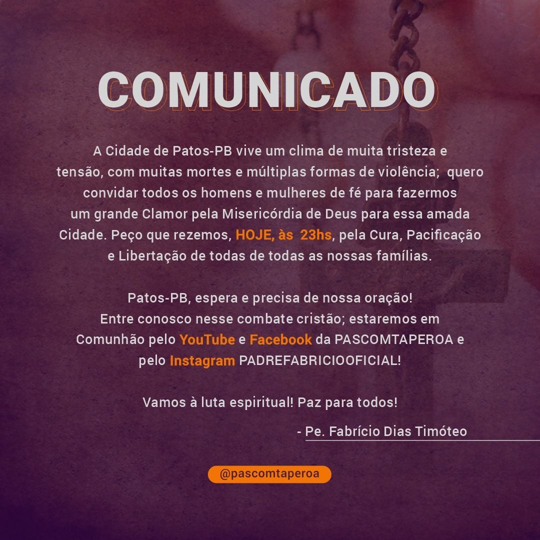 Um dos padres mais queridos da Diocese de Patos, Padre Fabrício Timóteo, sensível a esse trágico fato que ocorreu no município de Patos, clama a todos para se unirem em oração, neste domingo, dia 20 de março, às 23h, para rezar pela cura e libertação de todas as famílias, a fim de que todos possam se irmanar em oração.