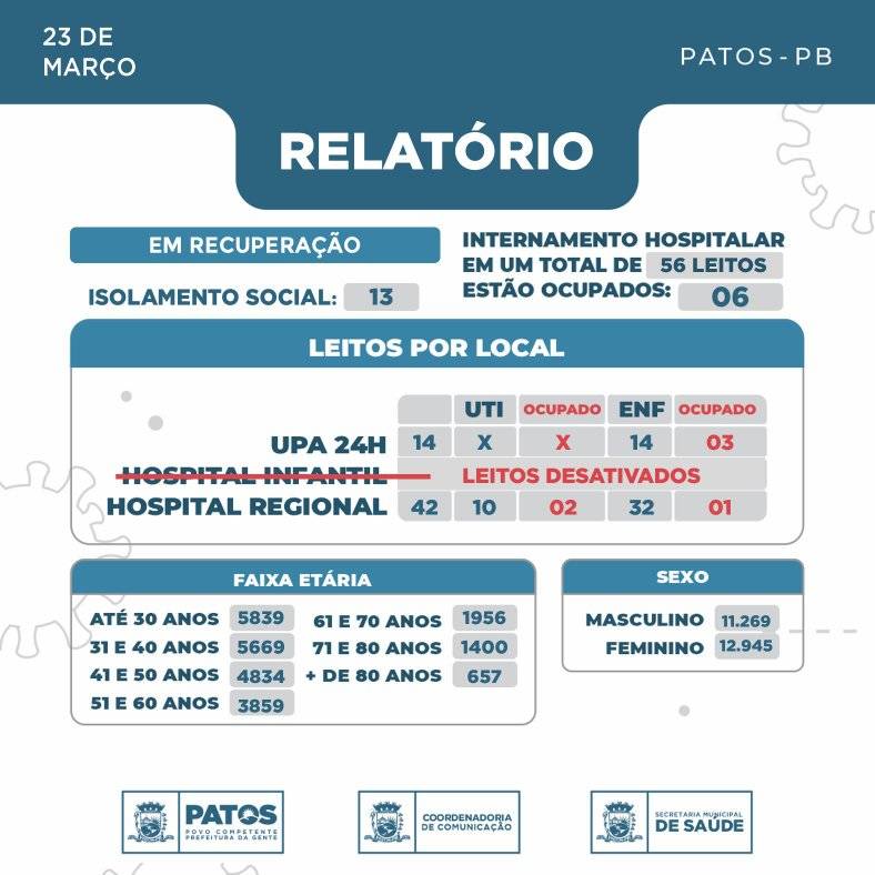 A Vigilância Epidemiológica de Patos informou, no Boletim desta quarta-feira, dia 23 de março de 2022, o total de 24.214 pessoas infectadas pela Covid-19 desde o início da pandemia.