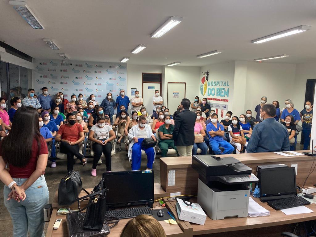 Nesta sexta-feira, os diretores geral, administrativo e clínico do Hospital, Francisco Guedes, Levi Firmino e Dr. Pedro Augusto, respectivamente, se reuniram com os contratados e agradeceram a dedicação e compromisso de todos durante o período em que trabalharam na unidade. “Queremos agradecer a todos vocês, desde os que ocuparam os cargos mais simples, como os que exigiam mais conhecimento técnico, pela dedicação, pelo apoio, pelas vidas que salvaram, pela fortaleza com que enfrentaram momentos muito difíceis, nossa gratidão, nosso respeito e nossa admiração a todos vocês e o desejo de boa sorte nesta caminhada por salvar vidas”, disse Francisco.