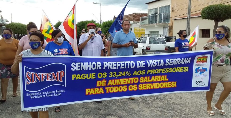 Foi realizada na última quarta-feira, dia 23 de março, uma manifestação dos professores e demais servidores públicos municipais de Vista Serrana, na Região Metropolitana de Patos, onde foi feita a cobrança do aumento salarial no percentual de 33,24% retroativo a 1° de janeiro do corrente, implantação da insalubridade para servidores que trabalham em locais insalubres, tais como os da saúde, auxiliares de serviços, merendeiras, dentre outros.