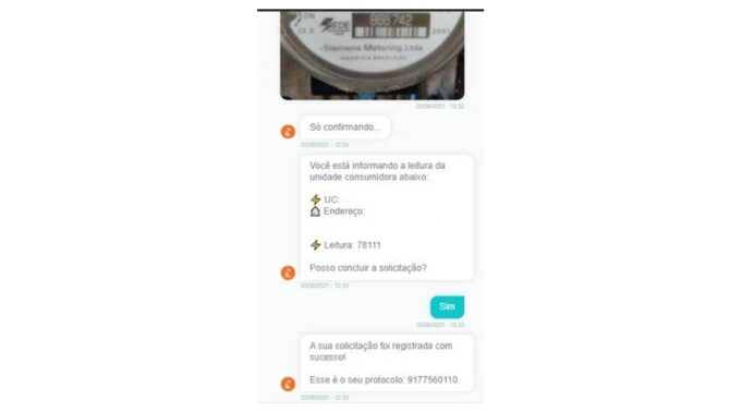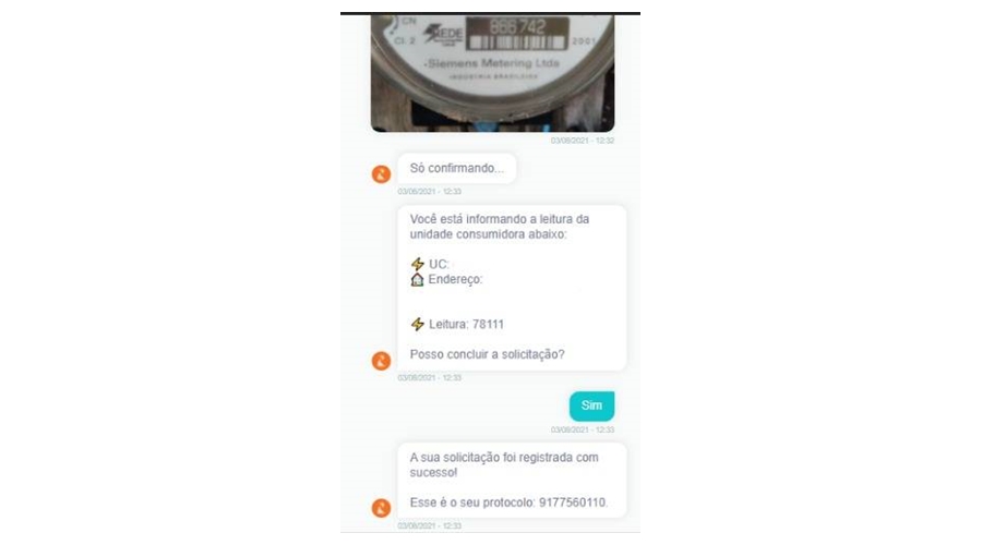 O cliente fotografa os números que aparecem no medidor e envia a imagem para a Gisa. Após o envio, a imagem é verificada pela inteligência artificial e, em seguida, devolvida para confirmação do cliente;