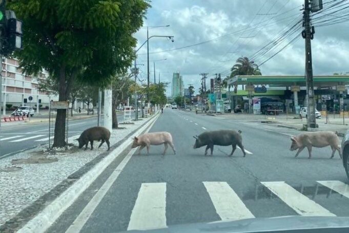 A foto de quatro porquinhos atravessando a Avenida Brasília, uma das mais movimentadas do bairro do Catolé em Campina Grande, viealizou na manhã desta quinta-feira (31). No melhor estilo da famosa capa do disco Abbey Road dos Beatles, os poucos atravessam na frente de uma faixa de pedestre próxima ao Partage Shopping.