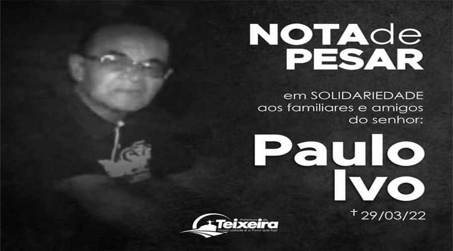 A Prefeitura de Teixeira, por meio da presente nota, vem a público manifestar profundo pesar e condolências aos familiares e amigos do senhor, Paulo Ivo Limeira da Costa, pelo seu falecimento, ocorrido na terça-feira, 29/03.