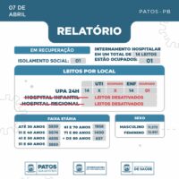 Nas últimas 24 horas não foi confirmado nenhum caso de Covid-19 em Patos; nesse mesmo período, 01 pessoa se recuperou; 02 estão em isolamento domiciliar e 01 em internamento hospitalar.