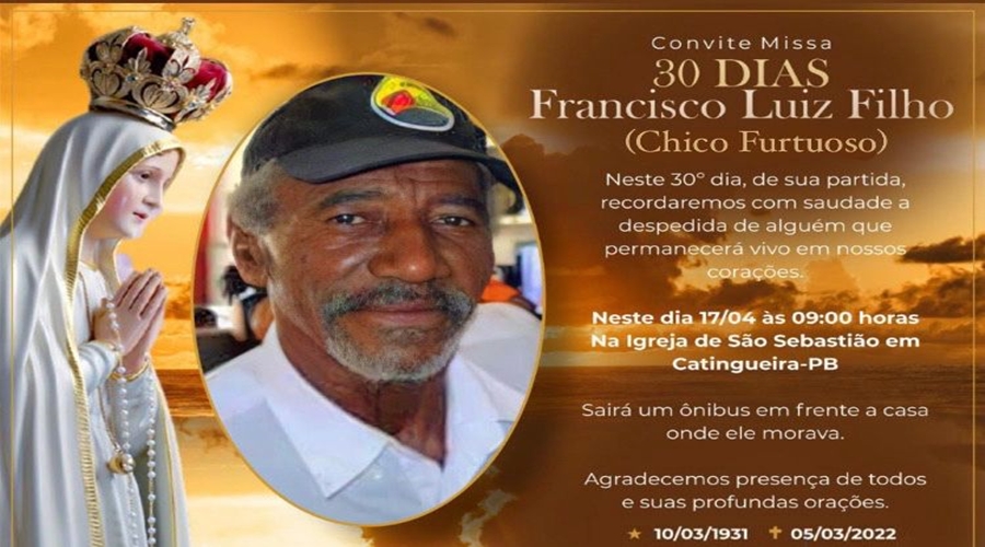 Familiares do senhor Francisco Luiz Filho (Chico Furtuoso) convidam parentes e amigos para a missa de 30º dia em sufrágio de sua alma.