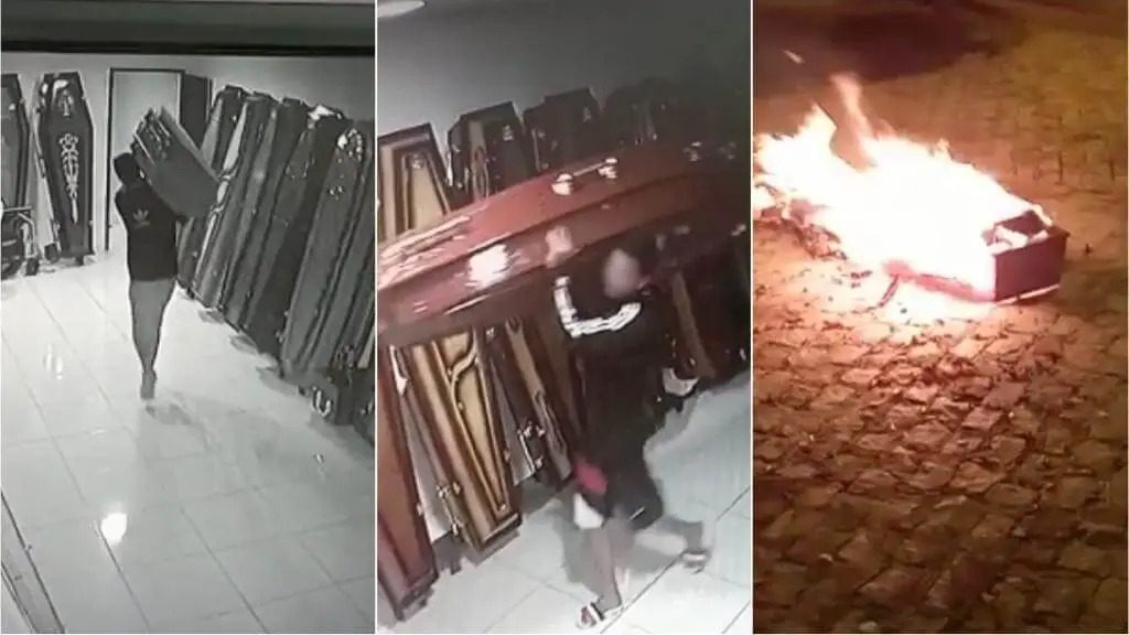 O circuito interno de segurança capturou toda a ação do suspeito e mostra o momento em que ele, trajado com uma jaqueta e short preto, chega na frente do prédio, empurra a porta por várias vezes e consegue entrar no estabelecimento. Já nas dependência internas da funerária, o mesmo vai até a parte onde estavam os caixões, pega um deles, coloca nas costas e se dirige até o cemitério.