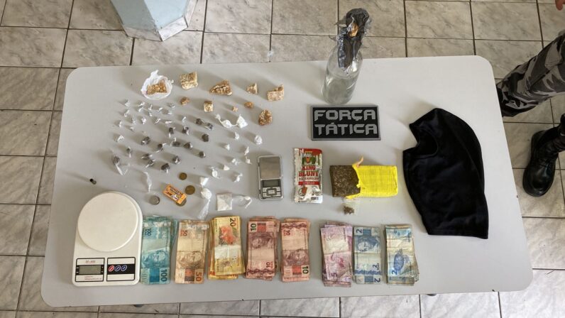 Além do suspeito, os PMs apreenderam um tablete de 405g de maconha, 185g de crack, 15 papelotes de cocaína, uma garrafa de éter, duas balanças de precisão, R$1.463,85 reais, uma moto Honda Broz, além de munição deflagrada.