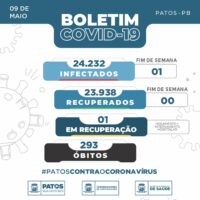 A Vigilância Epidemiológica de Patos informa, nesta segunda-feira, dia 09 de maio de 2022, o registro de 01 caso de Covid-19 neste final de semana.