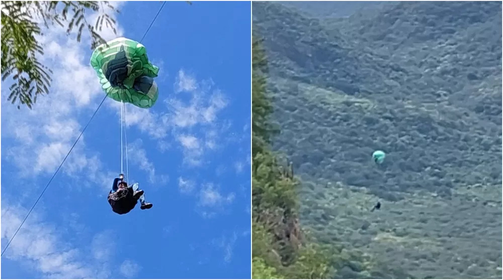 Os socorristas precisaram se pendurar em uma corda, conectada ao helicóptero, mas tiveram dificuldades para chegar até o parapentista.