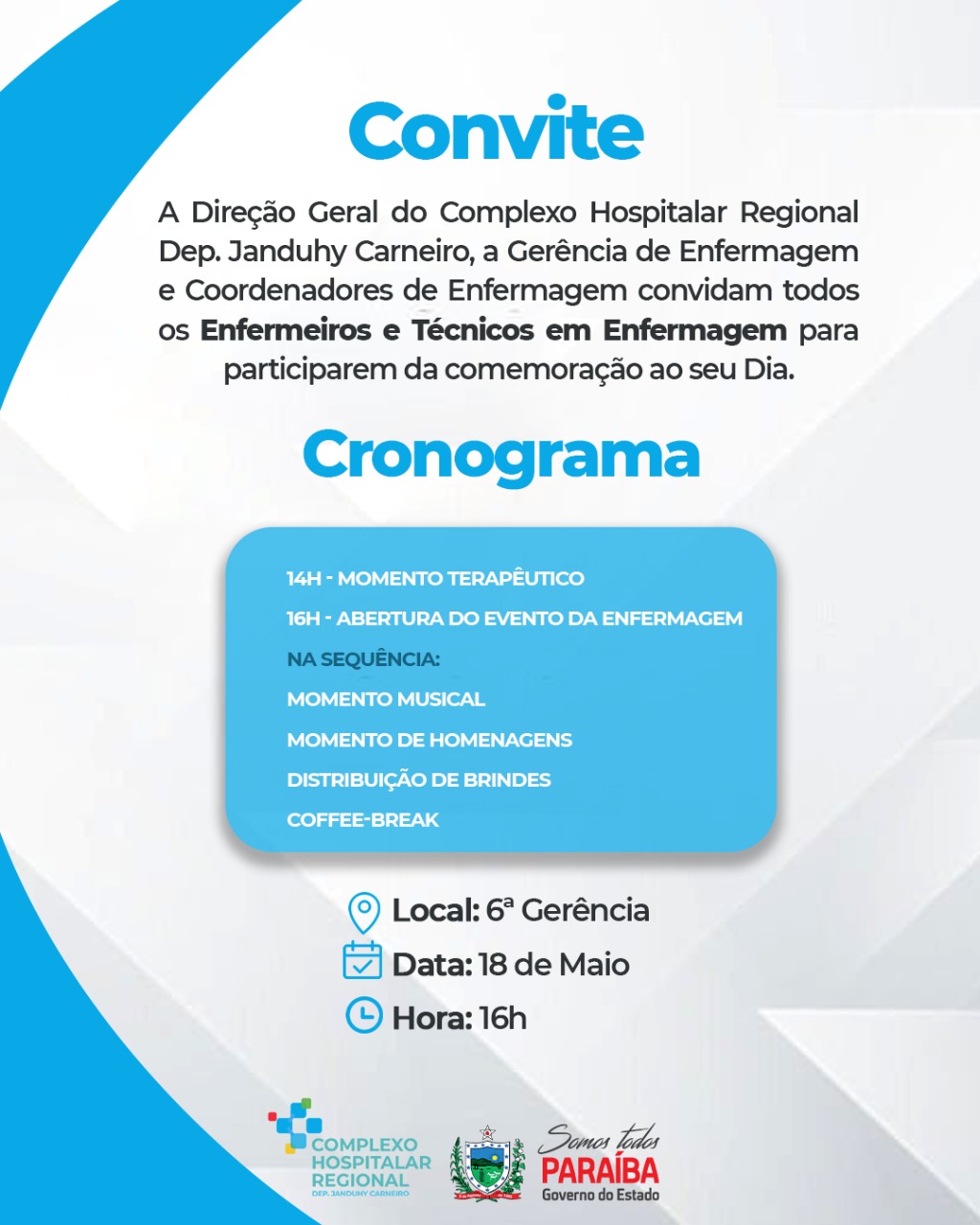 O último dia 12 de maio foi uma data especial para os enfermeiros e enfermeiras pois, nesta data se festeja o Dia Internacional da Enfermagem. Mas, a comemoração com a equipe de profissionais da Enfermagem do Complexo Hospitalar Regional Deputado Janduhy Carneiro de Patos (CHRDJC) será no próximo dia 18, com uma tarde diferente, que incluirá atividades terapêuticas, momento musical, de homenagens, distribuição de brindes e lanche coletivo.