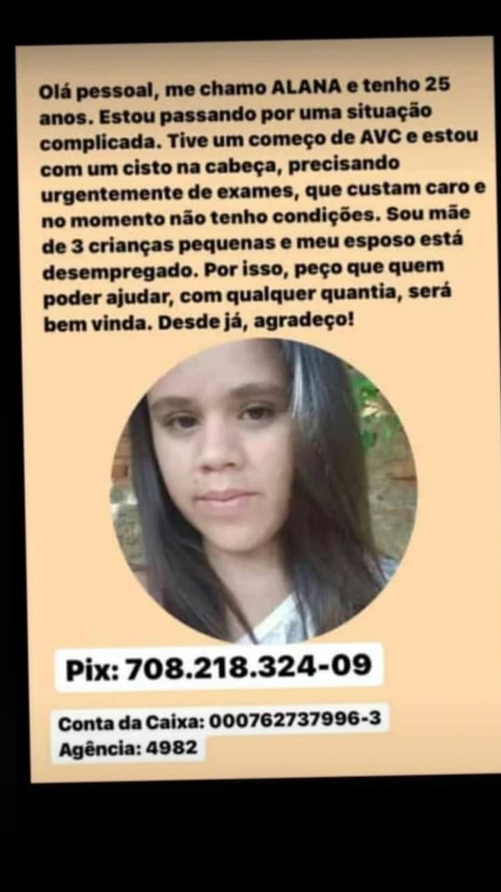 Alana está com um cisto no cérebro e precisa urgentemente realizar uma série de exames, que custam caros, e ainda tem que ter o acompanhamento de um neurologista e um fisioterapeuta. Ela e o esposo estão desempregados. O casal tem três filhos pequenos. O aluguel da casa está atrasado há mês. Eles precisam de ajuda financeira.