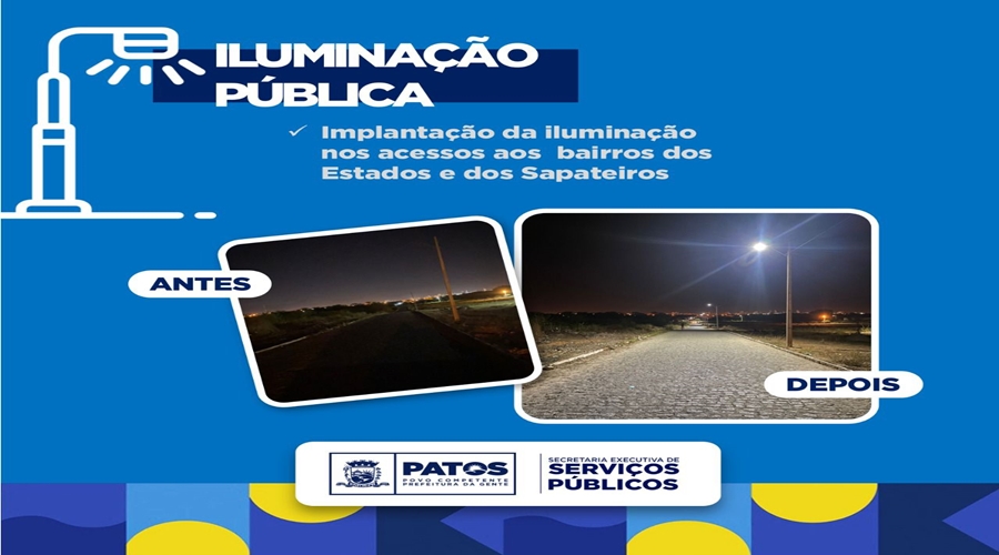 A Prefeitura de Patos, por meio da Secretaria de Serviços Públicos, finalizou nesta quinta-feira, 19, a implantação da iluminação pública no Bairro dos Sapateiros, Bairro dos Estados. A secretaria também realizou a manutenção em pontos específicos no Estádio Municipal José Cavalcante, e nos Cemitérios Públicos e trecho da Alça Sudeste que sofreram vandalismo com furto de cabos e fios.