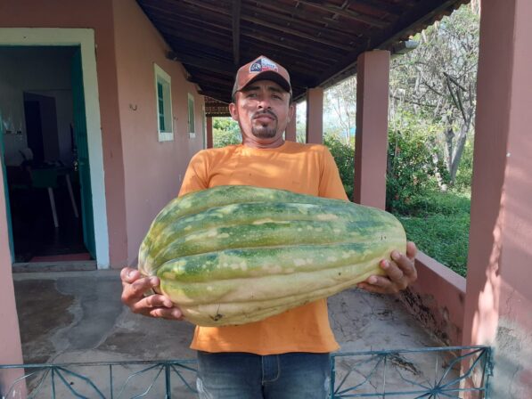 O agricultor José Leite Valdevino (Zé Vaqueiro ou Zé do Som), morador do Sítio Santa Cruz Jatobá, Piancó, colheu uma jerimum de 24,5 quilos.