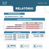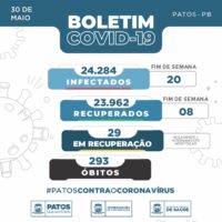 Sendo assim, Patos soma com 24.284 casos da Covid-19 registrados desde o início da pandemia, onde 23.962 são de recuperados e 293 óbitos.