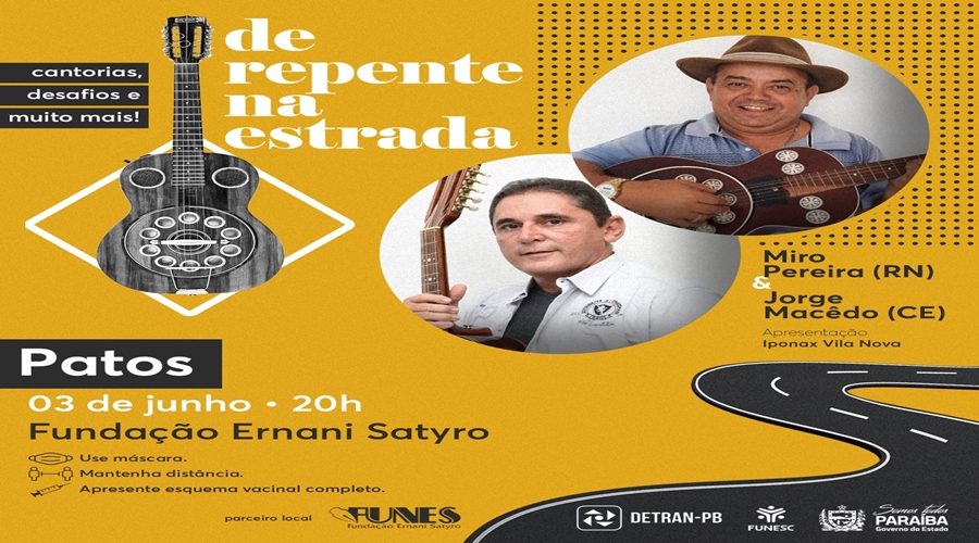 A Fundação Ernani Sátyro recebe nessa sexta-feira uma grande cantoria de viola dentro do Projeto “De repente na estrada”. O projeto é uma parceria da Fundação Espaço Cultural da Paraíba com o Detran-PB e vem percorrendo diversas cidades da Paraíba. Aqui em Patos o evento contará com os cantadores Miro Pereira (RN) e Jorge Macêdo (CE), que cantarão a partir das 20h, no Auditório da Fundação Ernani Sátyro. O evento é totalmente gratuito e a apresentação fica por conta de Iponax Vila Nova.