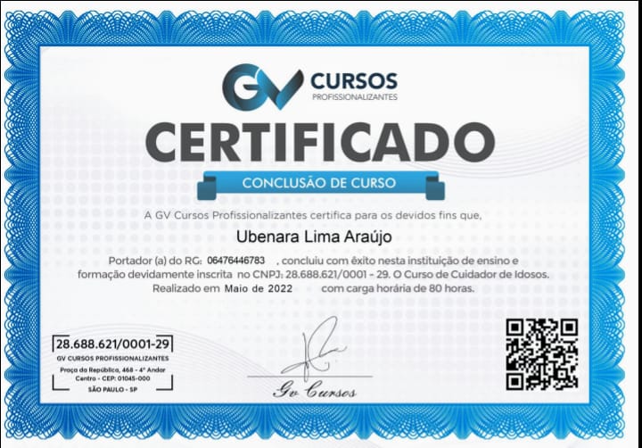 A estudante do curso técnico em enfermagem Ubenara Lima Araújo concluiu o Curso de Cuidador de Idosos realizado em maio deste ano de 2022 pela GV Cursos Profissionalizantes, em São Paulo (SP).