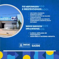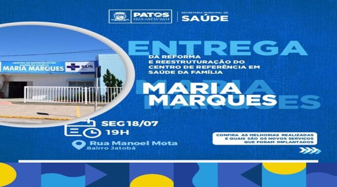 A Prefeitura de Patos, por meio da Secretaria Municipal de Saúde, realiza nesta segunda-feira, dia 18 de julho, às 19h, a solenidade de entrega da reforma e reestruturação do Centro de Referência em Saúde da Família Maria Marques, no bairro Jatobá, na Zona Sul de Patos.