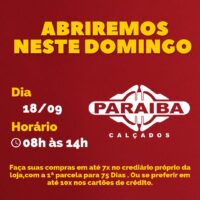 A Paraíba Calçados, na Rua Pedro Firmino, no centro de Patos, está repleta de novidades e para que você possa brincar na Festa de Nossa Senhora da Guia, que acontece até o 24 de setembro (sábado). Temos calçados femininos, masculinos, infantis, além de cintos, bolsas, carteiras e muito mais. Abriremos neste domingo, 18, das 8h às 14h, então não fique de fora e aproveite!