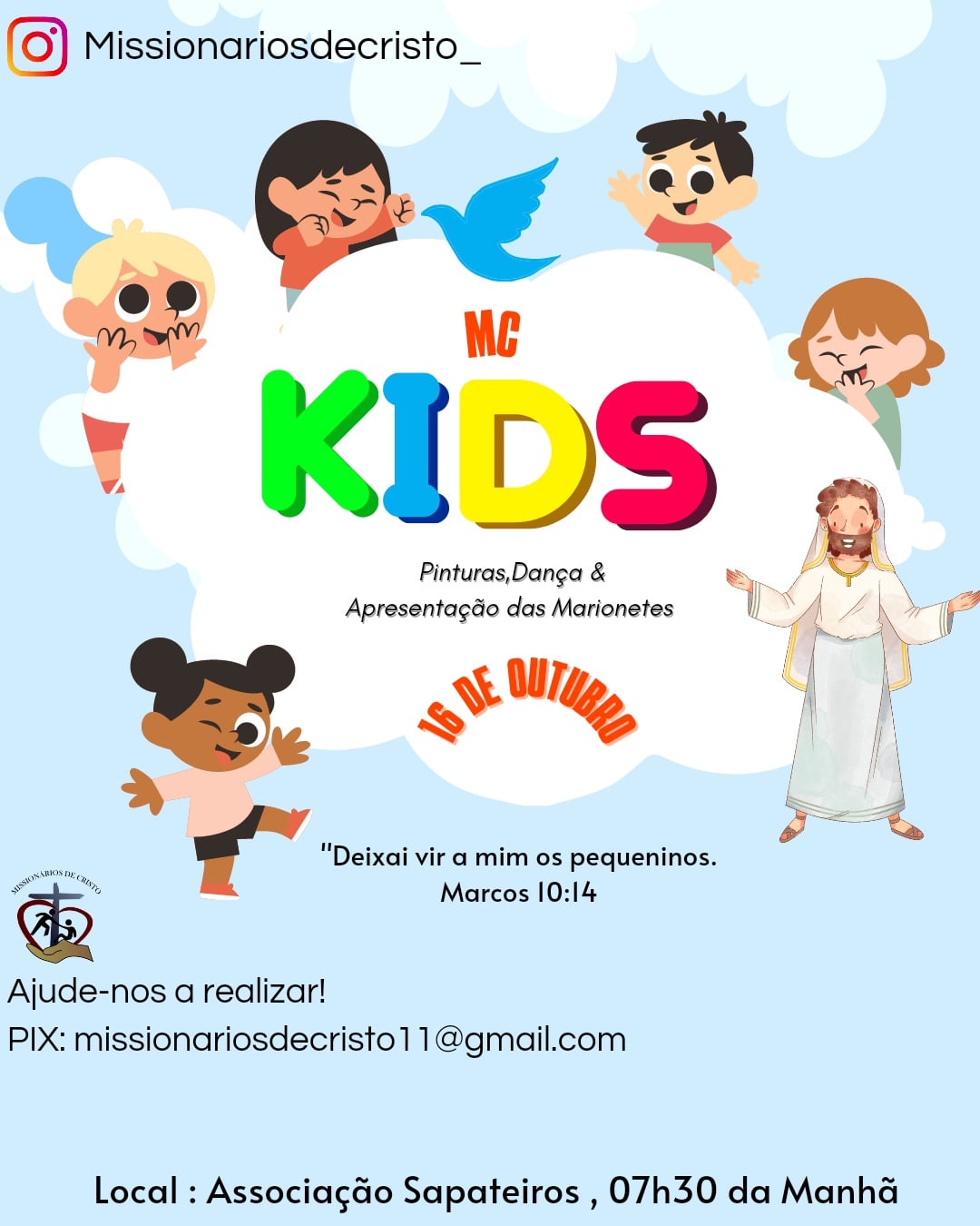 O Projeto Missionários de Cristo, que faz parte da Área Pastoral Santa Luzia, no bairro Monte Castelo, na zona sul de Patos, realizará mais uma vez o Dia das Crianças na Associação do Conjunto dos Sapateiros a partir das 7h30min no dia 16 de outubro. O evento contará com a participação de MC Kids e terá pinturas, dança e apresentação de marionetes.