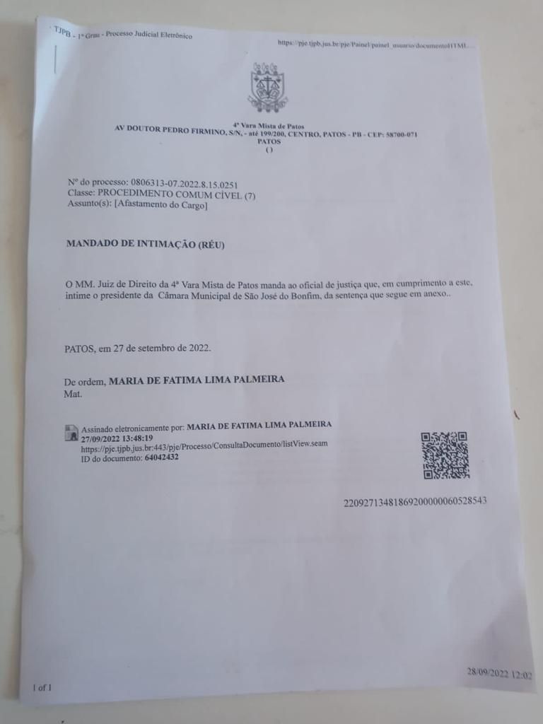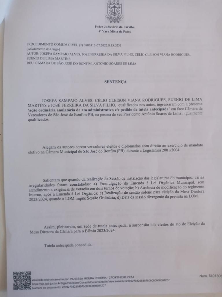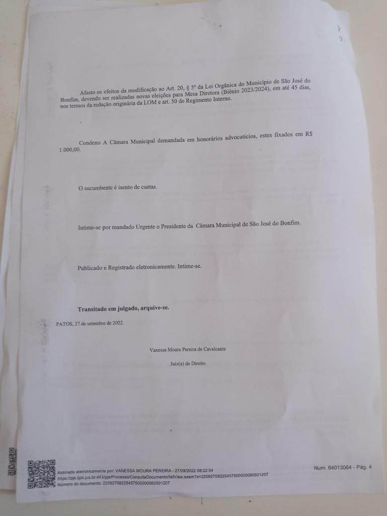 Na noite desta sexta-feira, dia 30 de outubro, houve uma sessão ordinária na Câmara Municipal de São José do Bonfim, na Região Metropolitana de Patos, onde foi anunciada uma decisão judicial, a qual quatro vereadores haviam impetrado na Justiça pedindo a anulação da sessão realizada no dia 27 de agosto de 2021, para o biênio 2023-2024.