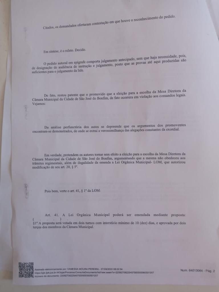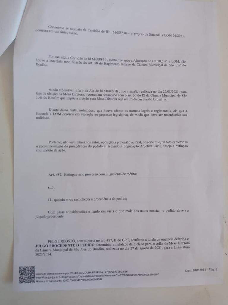 “PELO EXPOSTO, com suporte no art. 487, II do CPC, confirmo a tutela de urgência deferida e JULGO PROCEDENTE O PEDIDO determinar a nulidade da eleição para escolha da Mesa Diretora da Câmara Municipal de São José do Bonfim, realizada no dia 27 de agosto de 2021, para a Legislatura 2023/2024.”