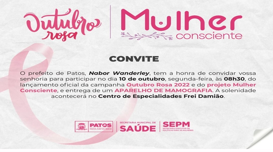Nesta segunda-feira (10), a partir das 8h30, o prefeito de Patos e o secretário de Saúde, Leônidas Dias, farão a abertura oficial da campanha Outubro Rosa e do projeto Mulher Consciente, e principalmente a entrega de um mamógrafo para o Centro de Especialidades Frei Damião.