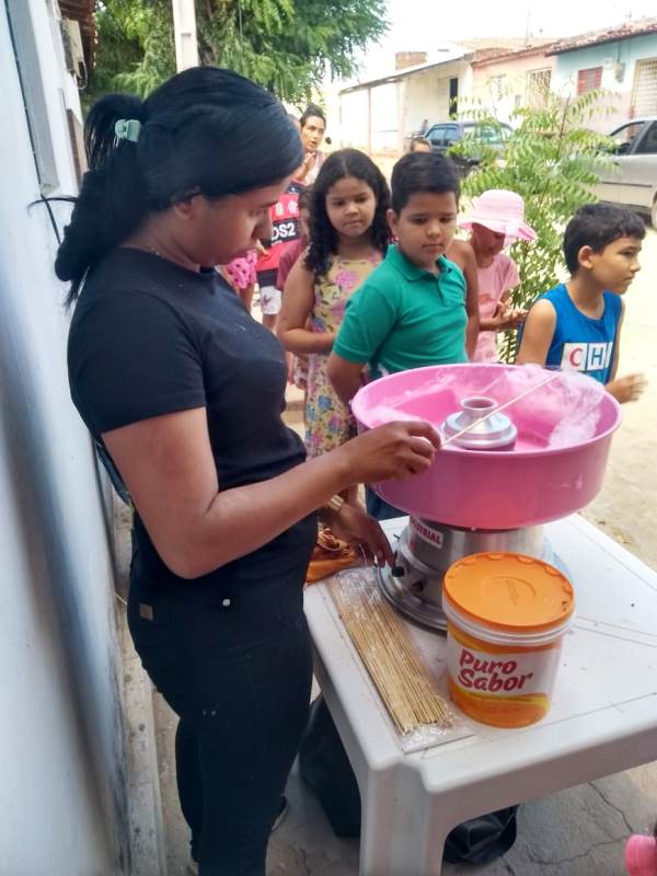As crianças também se revezaram no pula-pula e receberam algodão doce. A cabeleireira alugou uma máquina de algodão doce e o pula-pula com recursos próprios e contou com apoio de alguns familiares.