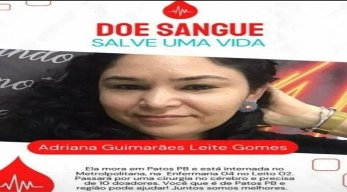 A patoense Adriana Guimarães Leite Gomes está precisando da ajuda de todos aqueles que possam fazer um gesto de solidariedade e doar sangue, visto que ela passará por uma cirurgia no Hospital Metropolitano de Santa Rita, na Grande João Pessoa, onde está internada, na Enfermaria 04, Leito 02.