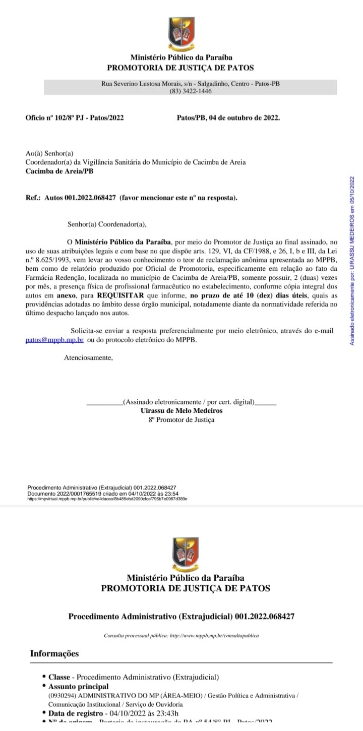 A Prefeitura de Cacimba de Areia, na Região Metropolitana de Patos, recebeu nesta semana, uma notificação do Ministério Público da Paraíba (MPPB), por meio do promotor Uirassu de Melo Medeiros, de uma farmácia que funciona na sede do município, porém, sem cumprir com uma das exigências do Conselho Federal de Farmácias, que é a presença de um farmacêutico no estabelecimento.