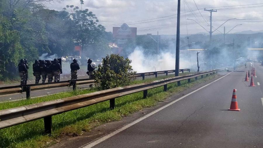 Imagens exibidas pela GloboNews mostraram, no começo da tarde, a Tropa de Choque em atuação na rodovia Castello Branco.